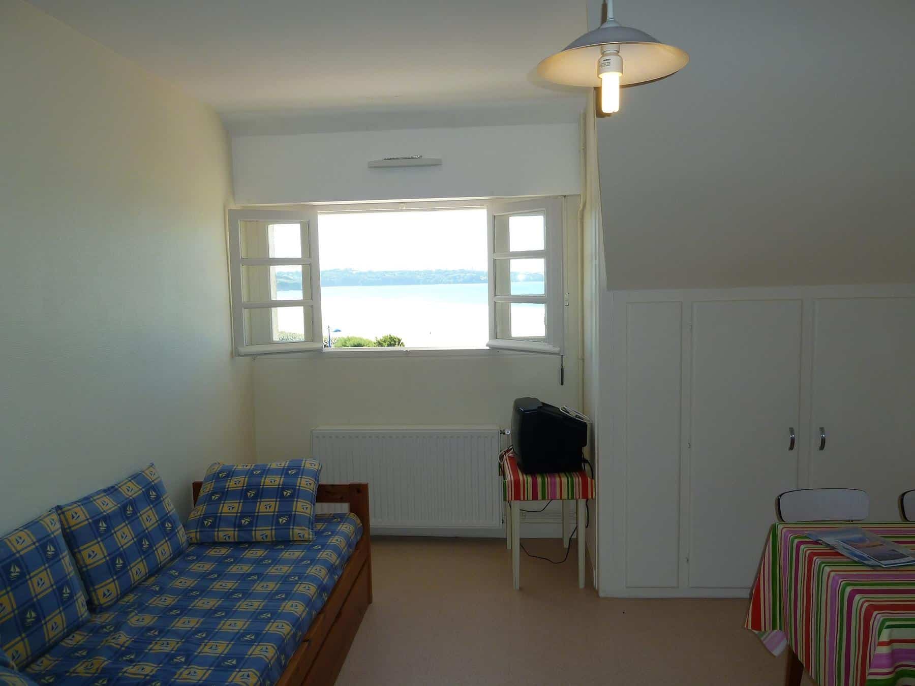 Une salle de séjour ; coin salon avec 1 lit/canapé 1 personne (lit gigogne) et vue sur la mer d’Iroise et la plage de Kervel